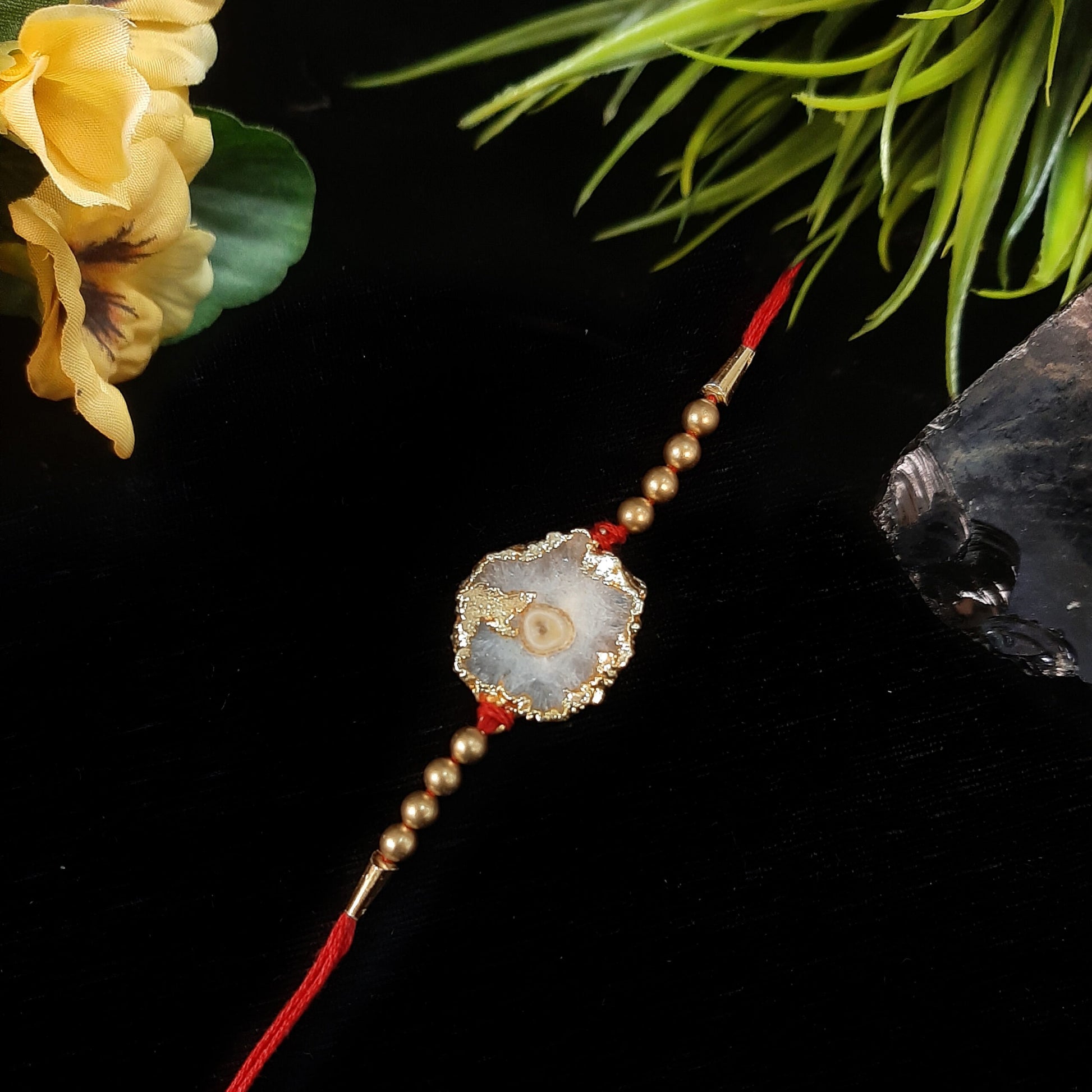 Richy made is the Rakhis with dials of semi-precious stones Agate. One Rakhi is in red thread with stones in between whereas the other has Golden Plated with stonework in between. Stunning Agate Stone Rakhi Gold plated. Agate slice Rakhi is made of natural agate stone with gold electroplated edges. The photo is of the actual product it will be as shown in the photo.